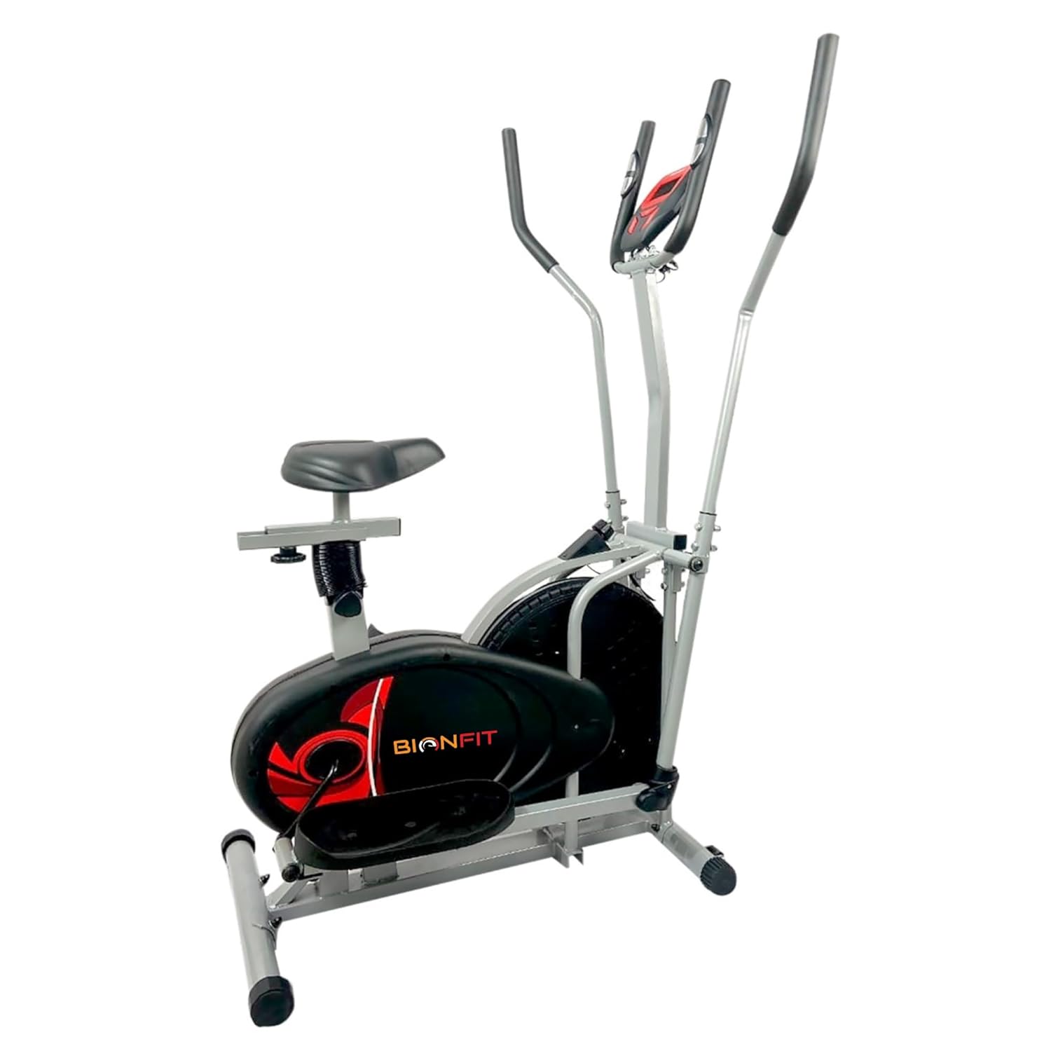 Achieve your fitness goals from the comfort of your home with the BIONFIT Elliptical Cross Trainer with Seat, a dual-action cardio machine designed for full-body workouts. This 2-in-1 elliptical and exercise bike provides both upper and lower body engagement, promoting fat loss, improved stamina, and muscle toning. The adjustable tension control allows you to set your desired resistance level, while the built-in LCD monitor tracks your time, speed, distance, calories burned, and pulse rate. Featuring a comfortable cushioned seat, non-slip pedals, and a sturdy, compact design, it’s perfect for users of all fitness levels. Ideal for home workouts, this cross trainer ensures a joint-friendly, low-impact cardio experience.